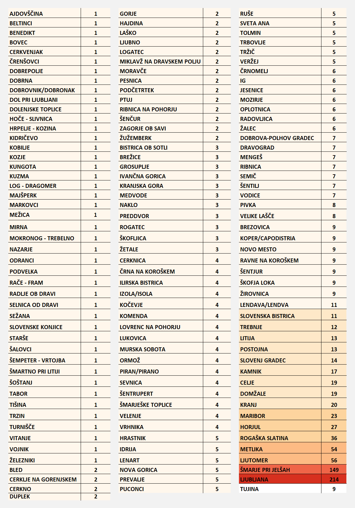 To je razporeditev obolelih po občinah ...