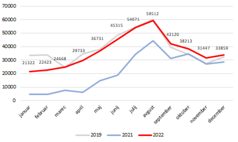 Vendar leto 2019 še vedno ostaja na vrhu lestvice glede prenočitev, kljub visokim številkam ga leto 2022 s petimi odstotki zaostanka ni prekosilo.