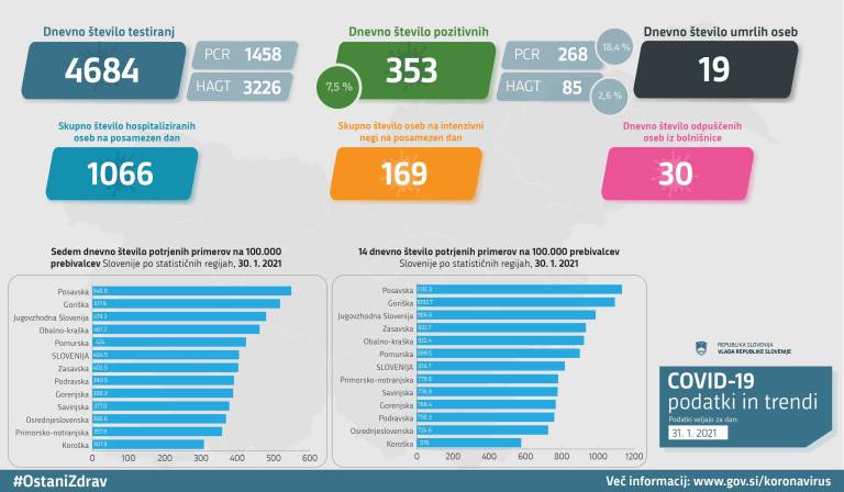 V Sloveniji so včeraj, 31. januarja, opravili 4684 testiranj na koronavirus in potrdili 353 novih okužb, gre za 7,5-odstotni delež.