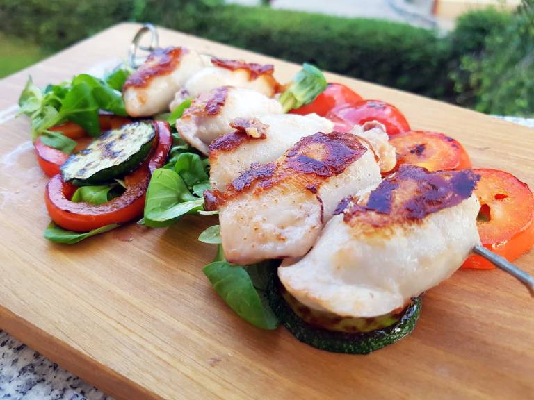 Na kulinaričnem blogu Sketa smo odkrili odličen recept za pripravo polnjenih lignjev z mocarelo, pršutom, česnom in drobnjakom. Zloženi na palici za ražnjiče, v družbi mediteranske zelenjave, so popoln obrok.