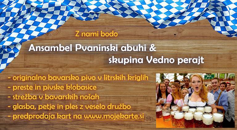 Ob še drugih bavarskih dobrotah bo nastopil ansambel mladih glasbenikov in večkratnih nagrajencev narodno zabavnih festivalov Pvaninski abuhi in skupina izkušenih glasbenih mačkov Vedno perajt.
