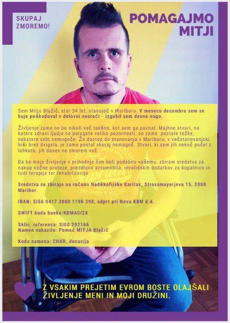 Zato lahko Mitju skupaj pomagamo in mu skušamo olajšati oziroma prilagoditi način življenja. Zaradi slednjega zbira sredstva za nakup nožne proteze, predelavo avtomobila, invalidske dodatke v kopalnici ter tudi za terapije in rehabilitacijo.