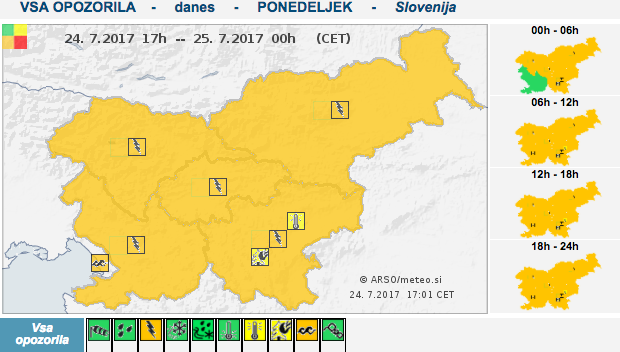 Po napovedih vremenoslovcev bodo popoldanske in večerne nevihte spremljala krajevna neurja z nalivi in močnejšimi sunki vetra. Ni izključen niti pojav toče, za celotno Slovenijo pa je izdano oranžno opozorilo za nevarnost neviht.