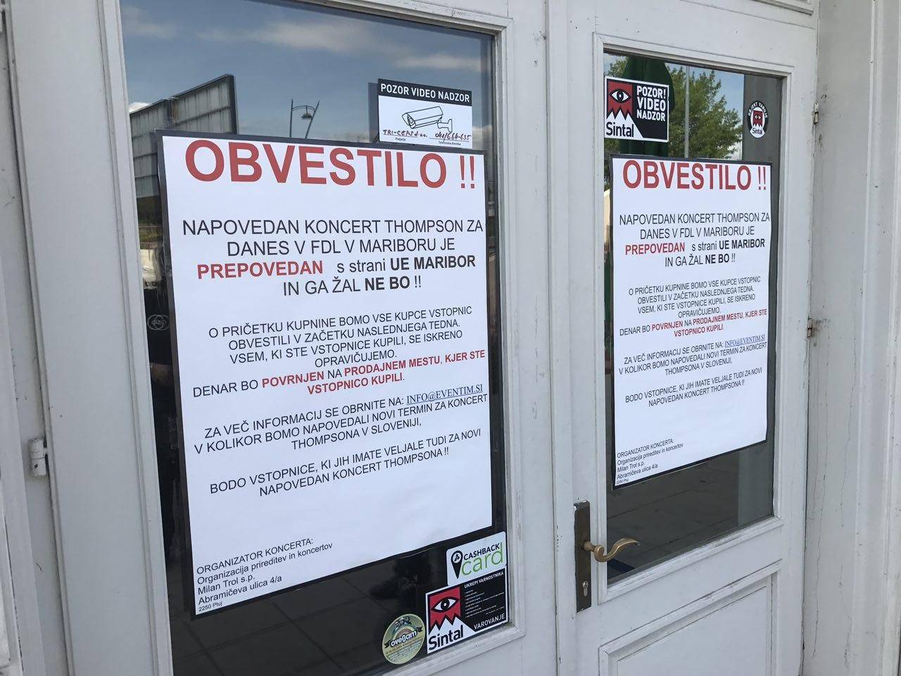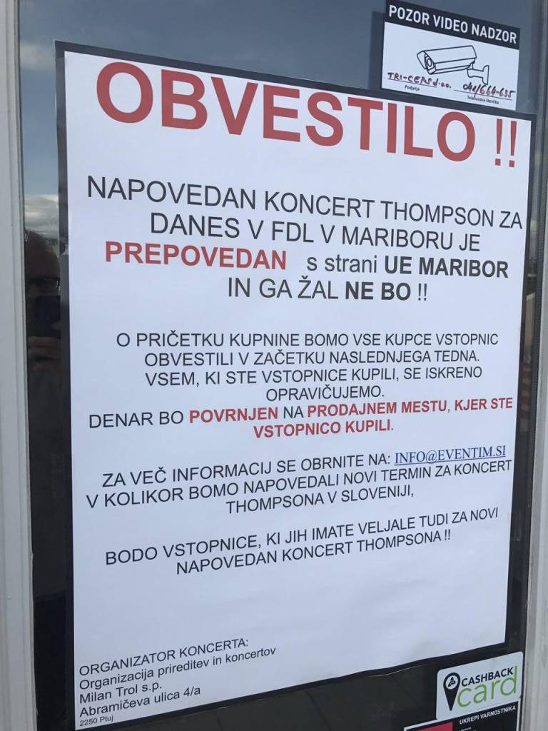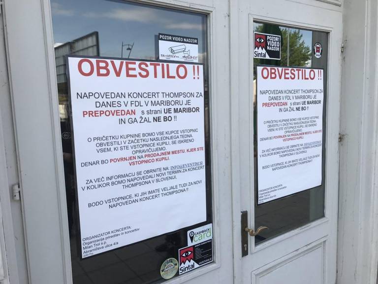 Organizator Thompsonovega koncerta v Mariboru se je po vseh dogodkih okoli prepovedi koncerta, moral vendarle sprijazniti s tem, da koncerta danes ne bo. Na vrata dvorane Lent je tako zalepil obvestila o prepovedi koncerta. Svoj prav bo poskušal doseči na sodiščih. Še vedno pa načrtuje izvedbo ne le enega, temveč več koncertov Thompsona po vsej državi.