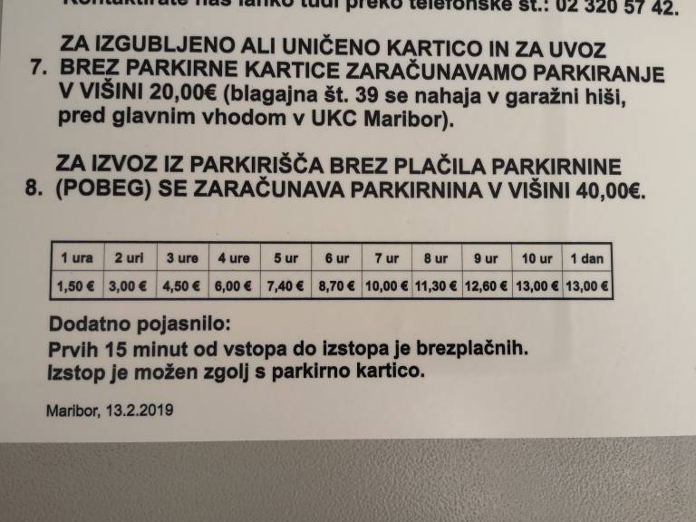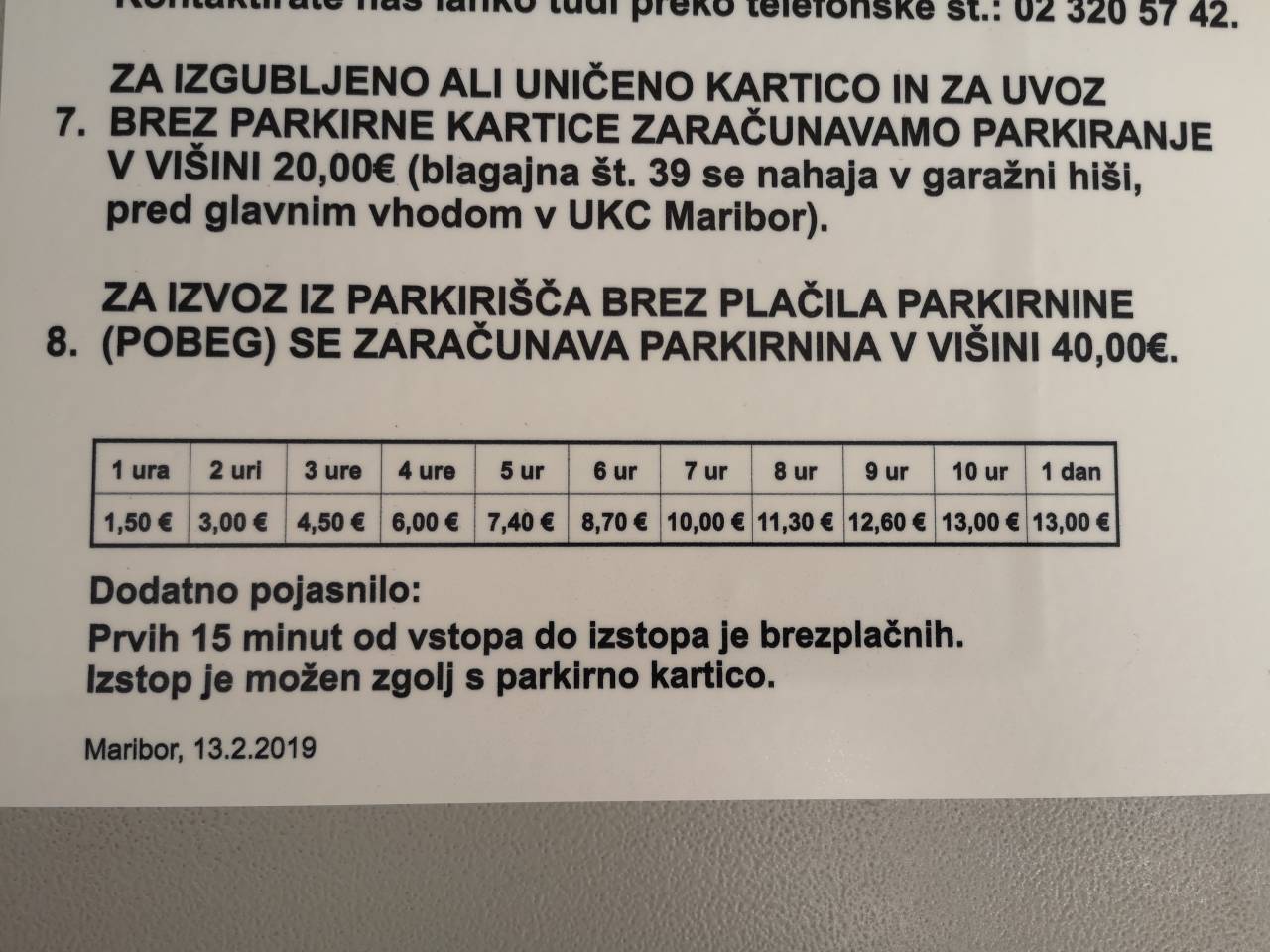 Za sedem ur parkiranja je treba pri mariborskem kliničnem centru odšteti deset evrov. Deset ur parkiranja ali celodnevno parkiranje znaša 13 evrov. V primeru izgube parkirnega listka 20 evrov.