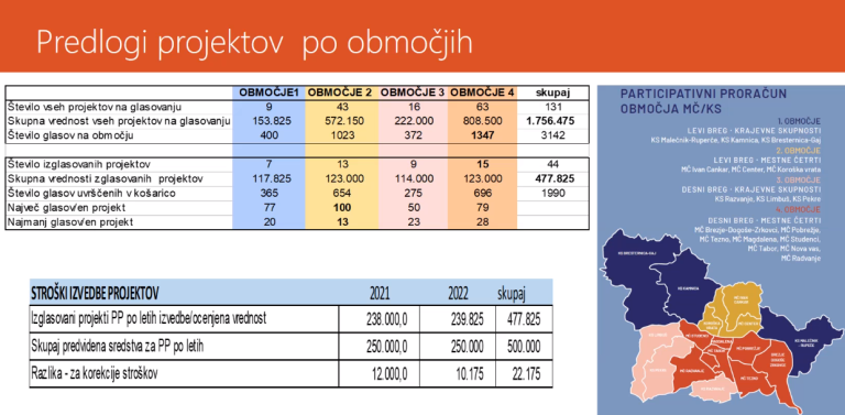 V območju štiri so največ glasov prejeli projekti za ureditev Stražunskega gozda, v območju ena, gre za krajevne skupnosti na levem bregu Drave, je največ glasov dobil projekt Kolesarski poligon oziroma »pumptrack« Malečnik, v območju tri, gre za krajevne skupnosti na desnem bregu pa vzpostavitev fitnesa na prostem in izgradnja igrišča za otroke.