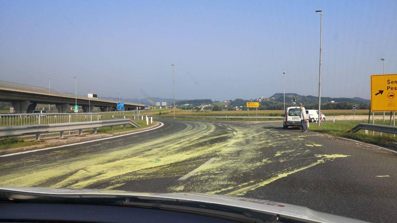 Vozniki pozor! V Pesniškem rondoju se je vozniku iz osebnega avtomobila razlila rumena barva.