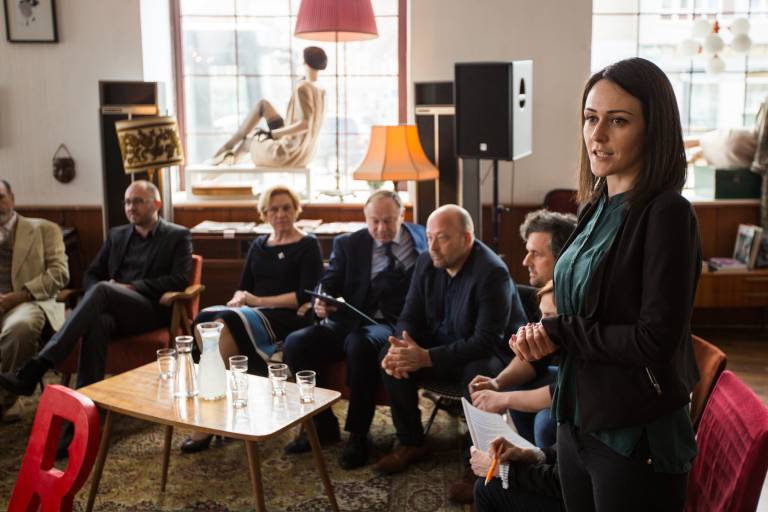 Branka Bezjak, novinarka Večera, in Andrej Gulič, predstavnik MKC, sta okroglo mizo otvorila z vprašanjem o lastništvu Piramide in načrtih, ki jih ima z gričem (novo) vodstvo občine. Podžupan in arhitekt Gregor Reichenberg pravi, da si »mestna občina sicer prizadeva za pridobitev lastništva Piramide; ampak ima zemljišče status kmetijske površine, kar je problem, saj občina nima statusa kmetovalca in ga tudi ne more dobiti«.