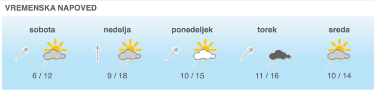 Pihal bo veter južnih smeri, ob morju jugo. Jutranje temperature bodo od 6 do 12, ob morju okoli 15, najvišje dnevne od 15 do 20, v alpskih dolinah okoli 12 stopinj Celzija.