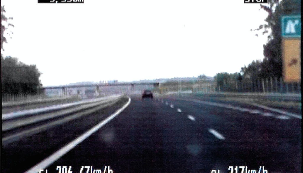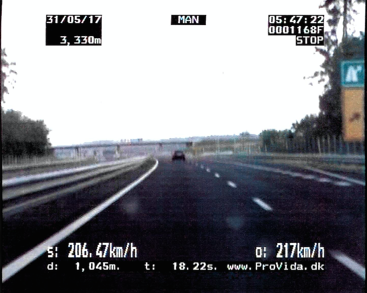 Okoli 5.45 ure so na avtocesti Draženci - Slivnica ugotovili, da je voznik osebnega avtomobila znamke Mercedes tip C na razdalji 1,045 metrov vozil s povprečno hitrostjo 206,47 kilometrov na uro.