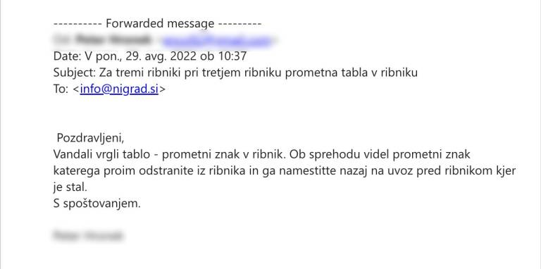Na javno komunalno podjetje, kot je razvidno iz e-pošte se je obrnil s prošnjo, da bi pristojni prometni znak odstranili in ga namestili nazaj na uvoz pred ribnikom, kjer je tudi prvotno stal.
