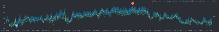 Najvišja temperatura v letu 2024 je bila izmerjena 13. avgusta 2024, ob 15.30, ki je znašala 33,5 stopinje Celzija.