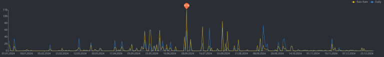 To je dobrih 400 milimetrov več, kot znaša letno povprečje količine dežja v desetih letih (921,2 milimetra). Največ dežja je padlo septembra 2024, ko je padlo 238,5 milimetra dežja.