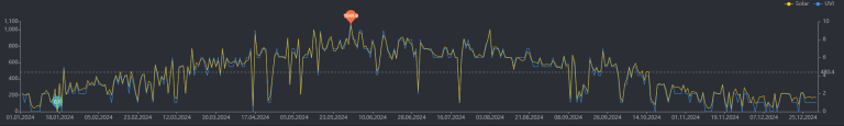 Najvišja je bila 31. maja 2024, ob 13,30, z 1049,9 Wattov na kvadratni meter. To je bilo dobre pol ure po tem, ko je bilo Sonce v zgornji kulminaciji. Takrat je bilo Sonce 9 stopinj čez nebesni poldnevnik opazovalca nad amatersko vremensko postajo.