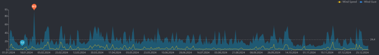 Najvišji sunek vetra lani je bil izmerjen 26. januarja 2024, ob 20.00, z 92,5 kilometra na uro, oziroma 25,7 metra na sekundo.