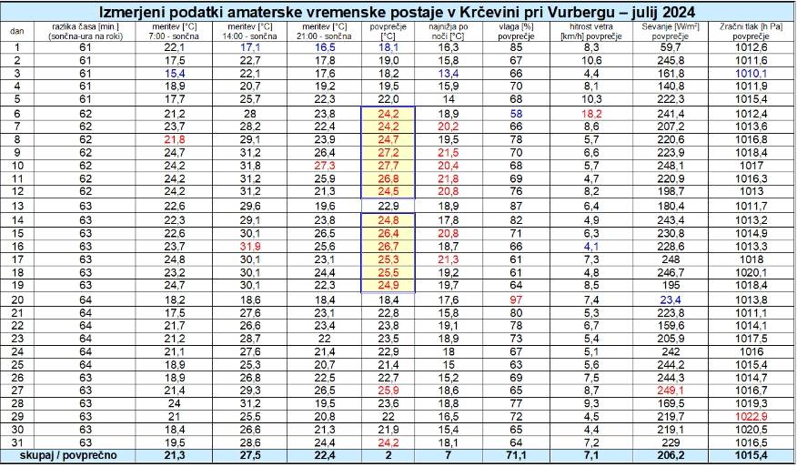 Amaterska vremenska postaja v Krčevini pri Vurbergu je v juliju 2023 izmerila povprečno mesečno temperaturo 22,0 stopinje Celzija. V juliju 2024 pa 23,4 stopinje Celzija, kar je za kar 1,4 stopinje Celzija več kot lani.