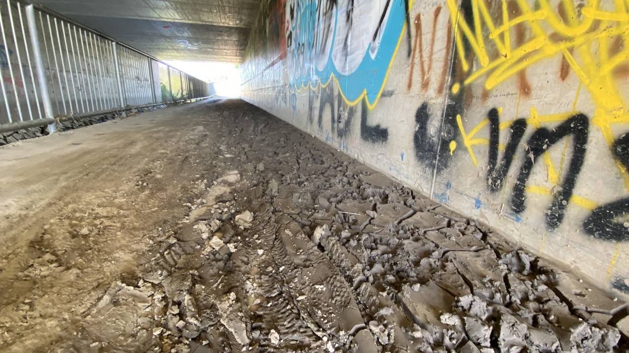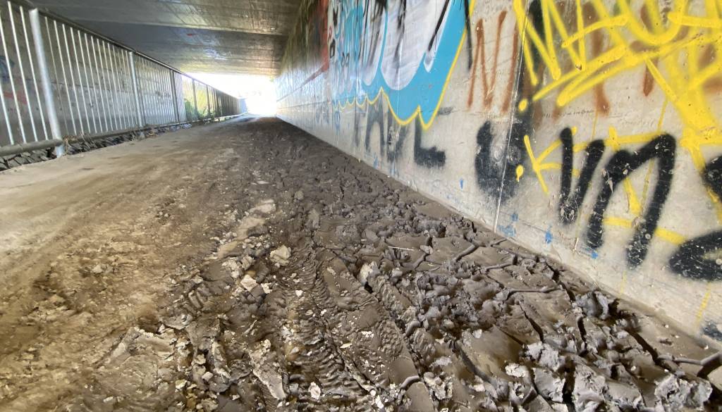 Podhod pri Pekrskem potoku je še vedno, že dober mesec dni poln blata. Blato na sredini podhoda je mokro in spolzko, in ga je na določenih mestih tudi več centimetrov.