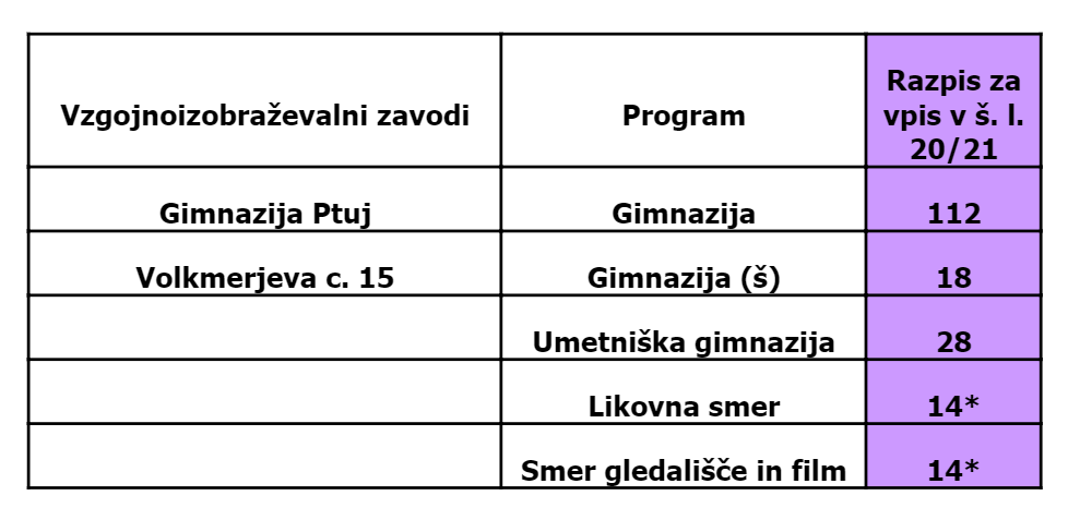 Gimnazija Ptuj je doslej ponujala program splošne gimnazije in športni oddelek, septembra pa bo uvedla še umetniški oddelek. V slednjem bo skupno na voljo 28 vpisnih mest: 14 na likovni smeri in 14 na smeri gledališče in film.
