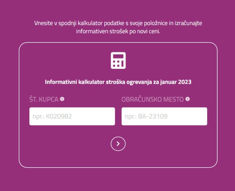 Kot je prikazano na spodnji sliki, v okvirček na spletni strani vnesete številko kupca in obračunsko mesto, informativni kalkulator pa vam samodejno izračuna stroške ogrevanja za januar 2023.