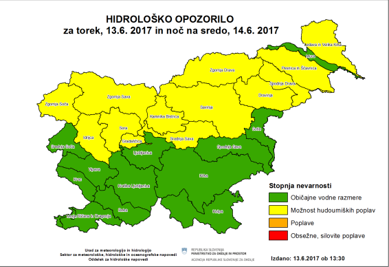Sicer pa so državni meteorologi za danes zvečer in za noč na sredo že popoldne izdali opozorilo o možni porasti hudournikov in zalednih voda. Največ možnosti za ta pojav je v hribovitih delih severovzhodne, severne in severozahodne Slovenije. Možna so tudi razlivanja.