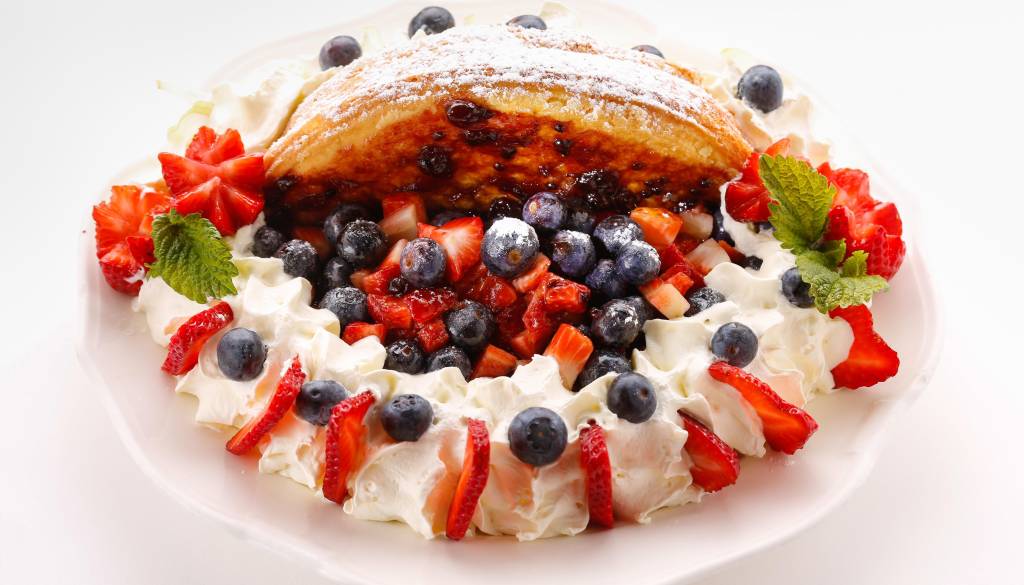 Medtem ko se omleta peče, stepemo sladko smetano. Pečeno omleto vzamemo iz pečice in na eni polovici debelo premažemo z brusnično marmelado. Prepognemo in serviramo na krožnik. Poškropimo z mentolovim likerjem, ob strani okrasimo s stepeno smetano in postrežemo.