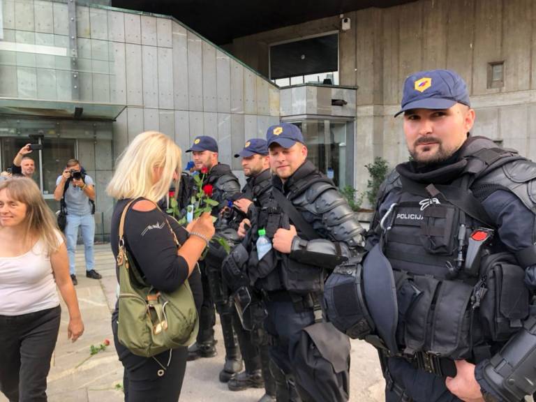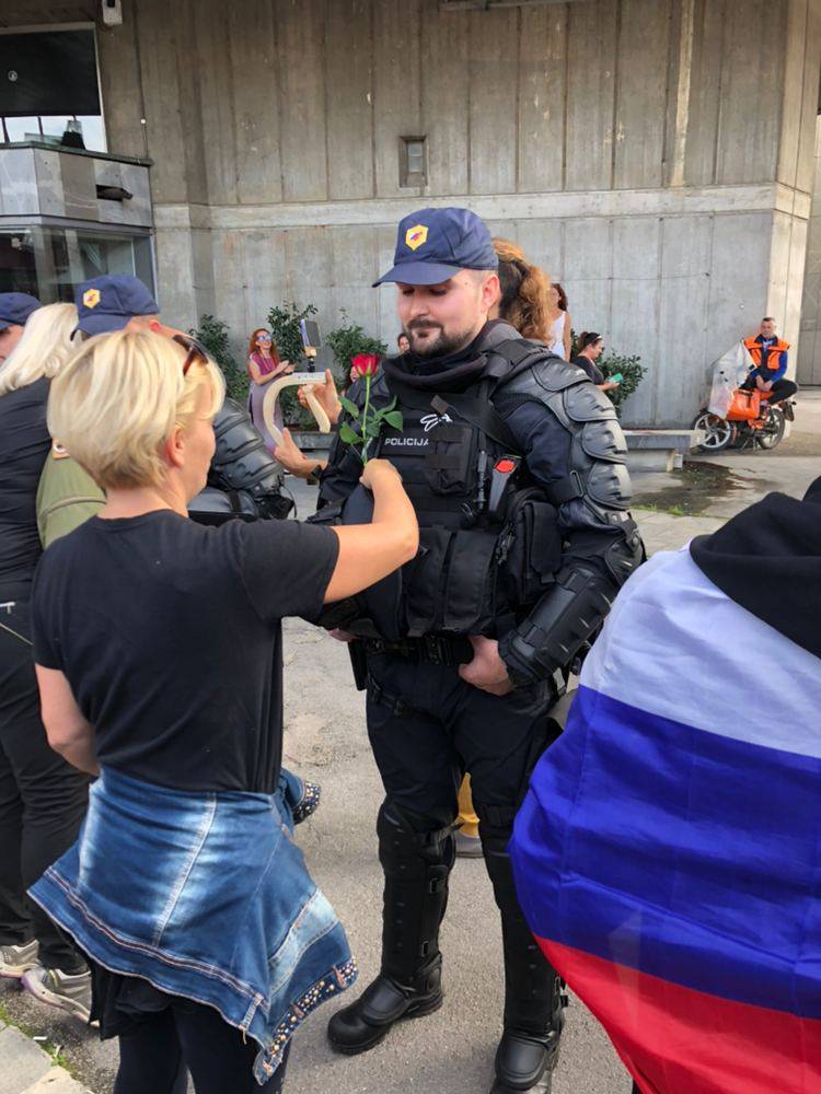 15.45 - Protestniki so policistom na neprebojne jopiče zataknili rdeče vrtnice in jim ploskali. Policisti stojijo mirno kot britanska kraljeva straža.