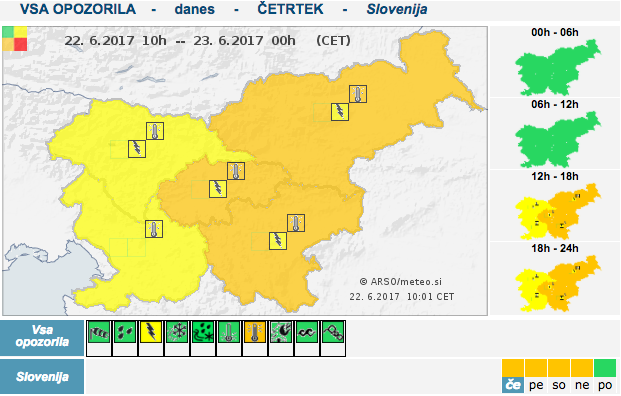 Agencija Republike Slovenije za okolje je tudi za danes izdala opozorilo, da bo sredi dneva in popoldne v večjem delu Slovenije znova velika toplotna obremenitev.