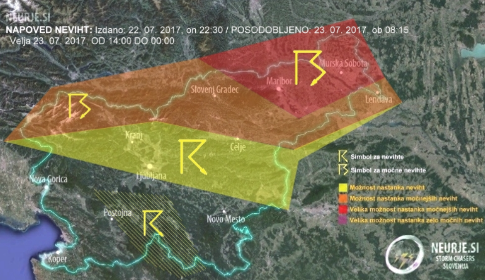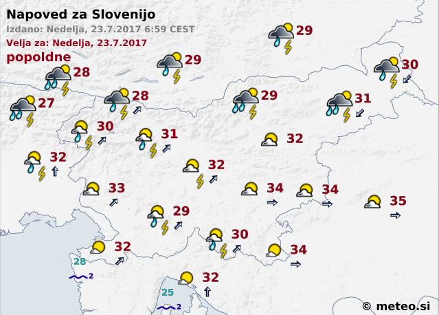Krajevne nevihte, ki bodo pogostejše v severni in vzhodni Sloveniji, se bodo zavlekle tudi v noč. Sprva bo še pihal jugozahodnik, popoldne pa bo v severovzhodni Sloveniji zapihal severni veter. Najvišje dnevne temperature bodo od 28 do 34 stopinj.