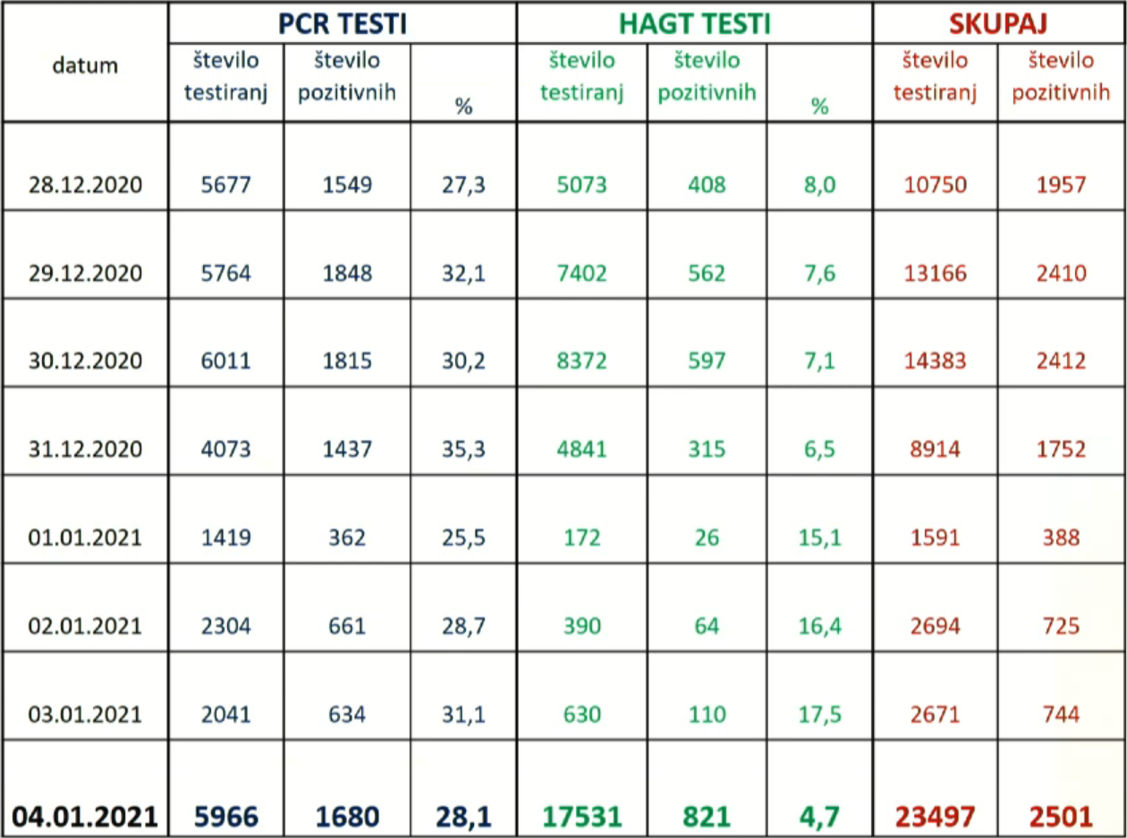 V Sloveniji so včeraj, 4. januarja, opravili 23.497 testiranj na koronavirus in potrdili 2501 novo okužbo. To pomeni, da je bil delež pozitivnih testov tokrat 28,2-odstoten.
