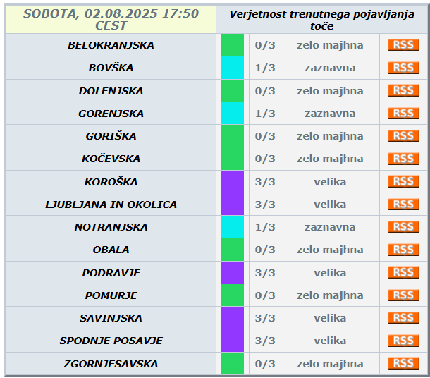 Po Sloveniji se danes vrstijo neurja z močnimi sunki vetra, nalivi in točo. Po podatkih Agencije Republike Slovenije za okolje je verjetnost pojavljanja toče največja v regijah Koroška, Podravje, Savinjska, Spodnje Posavje in Ljubljana z okolico, kjer je stopnja nevarnosti označena z najvišjo možno stopnjo.