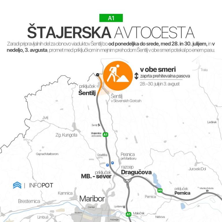 V tem obdobju bo promet med priključkom in mejnim prehodom Šentilj potekal po enem pasu v vsako smer.