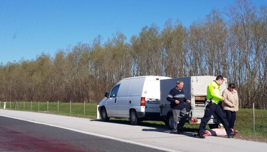 Med vožnjo je iz priklopne prikolice padel prašič, ki je zaradi poškodb poginil na kraju nesreče. Nesrečnega prašiča so pristojne službe že umaknile z vozišča, promet tako ni več oviran.