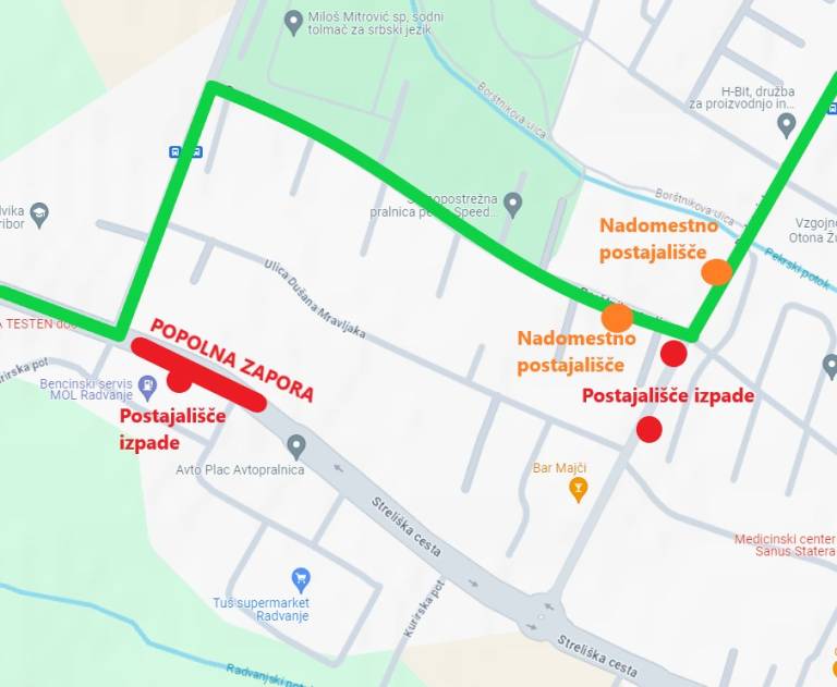 Med zaporo nista v uporabi avtobusni postajališči Streliška–Pohorskega odreda in Radvanjska–Borštnikova.