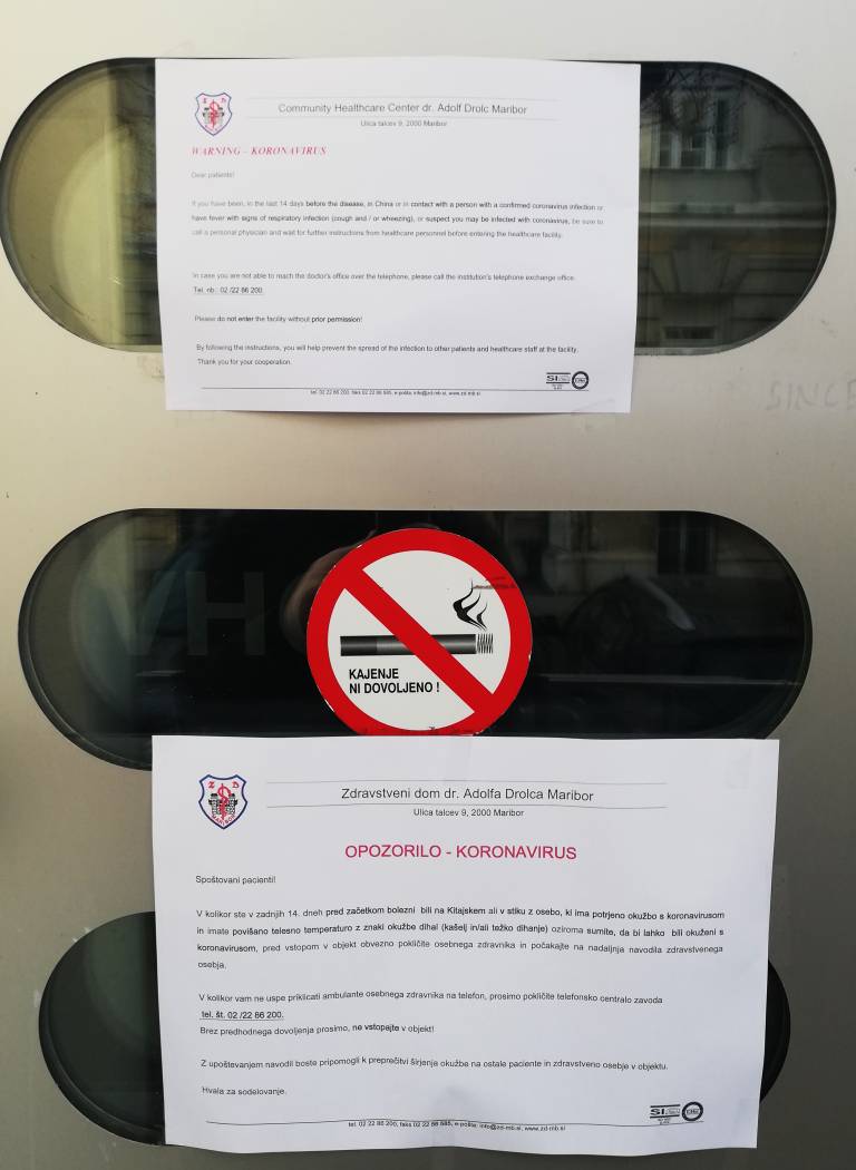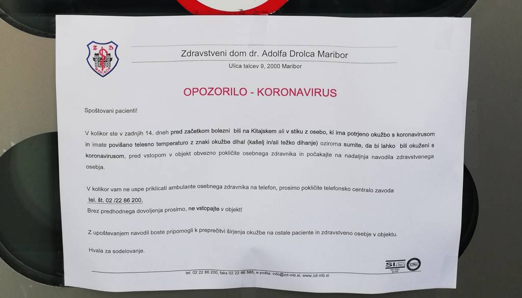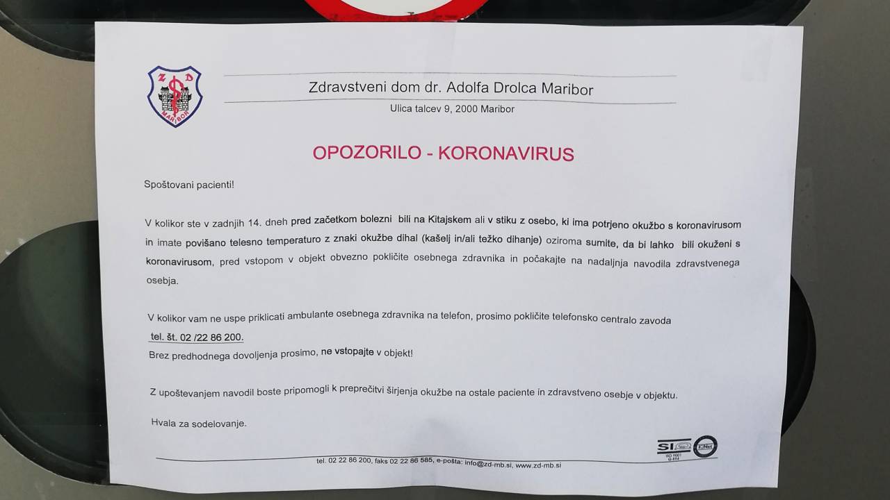 »V kolikor ste v zadnjih 14. dneh pred začetkom bolezni bili na Kitajskem ali v stiku z osebo, ki ima potrjeno okužbo s koronavirusom in imate povišano telesno temperaturo z znaki okužbe dihal (kašelj in/ali težko dihanje) oziroma sumite, da bi lahko bili okuženi s koronavirusom, pred vstopom v objekt obvezno pokličite osebnega zdravnika in počakajte na nadaljnja navodila zdravstvenega osebja,« piše na vratih Zdravstvenega doma dr. Adolfa Drolca na Sodni ulici 13 v Mariboru.