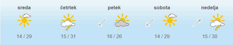 Najnižje jutranje temperature bodo od 10 do 16, najvišje dnevne od 26 do 32 stopinj Celzija.