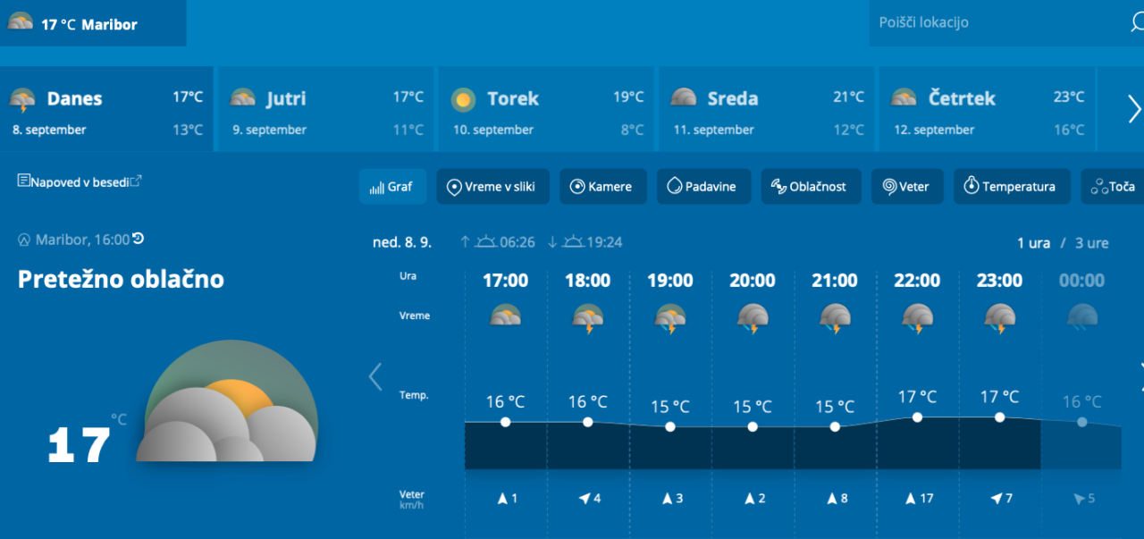 Zvečer in v prvem delu noči se bo pas dežja z nevihtami pomikal čez Slovenijo proti vzhodu. Možne bodo močnejše nevihte z nalivi. Nato bo dež prehodno ponehal, v zgodnjem jutru pa se bodo od zahoda spet začele pojavljati plohe in kakšna nevihta. Najnižje jutranje temperature bodo od 8 do 13, ob morju 15 stopinj Celzija, napovedujejo na Agenciji Republike Slovenije za okolje.
