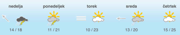 Jutri dopoldne bo spremenljivo do pretežno oblačno. Občasno bodo krajevne plohe in posamezne nevihte, ki bodo popoldne od zahoda ponehale, hkrati pa se bo jasnilo. Najvišje dnevne temperature bodo od 17 do 22 stopinj Celzija.