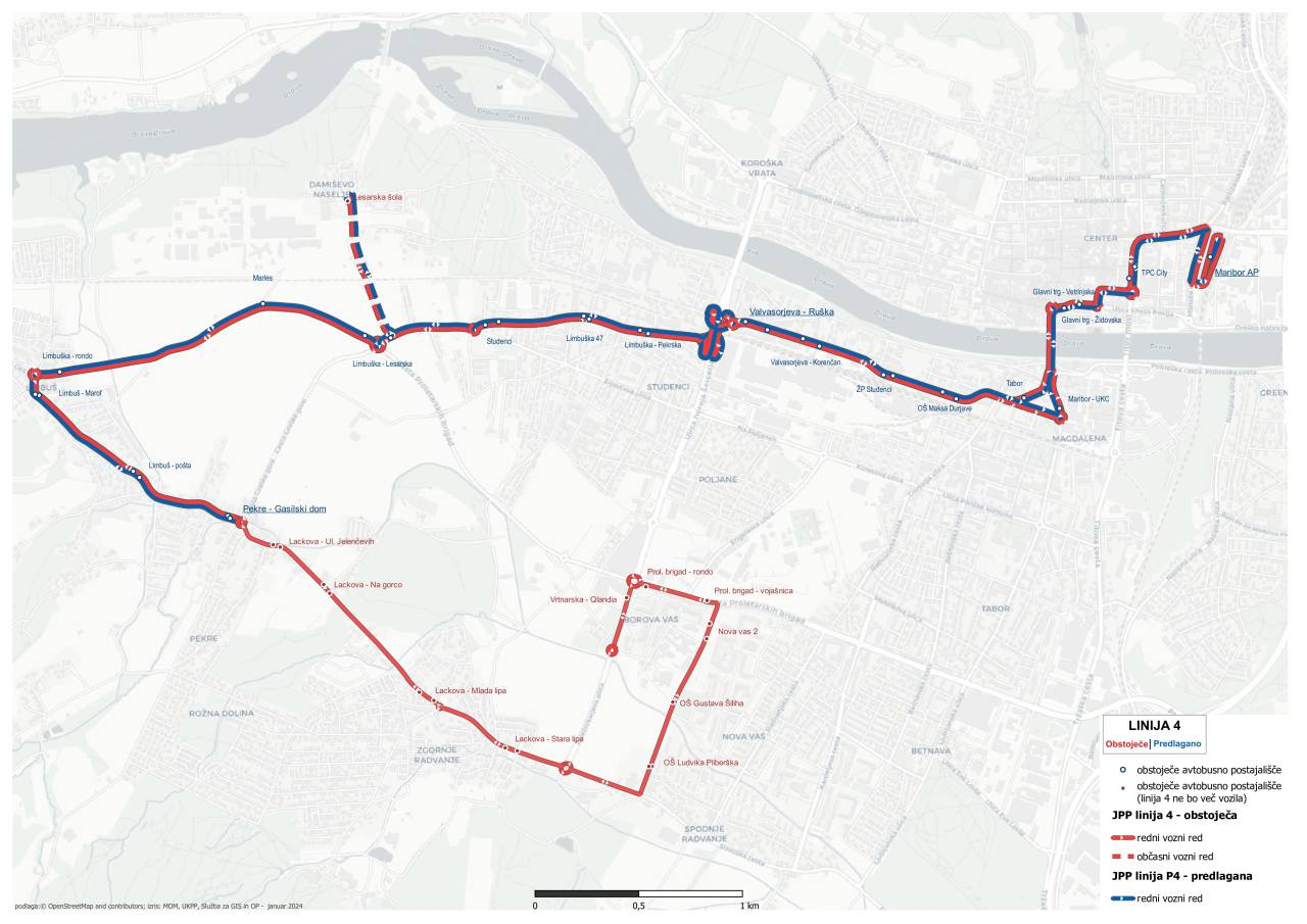 Kot je razvidno v predlogu sprememb, bi avtobusna linija 4 ostala na svoji obstoječi trasi. Vendar bo prišlo do spremembe, saj bi se njeno končno postajališče iz Borove vasi premaknilo do gasilskega doma v Pekrah.