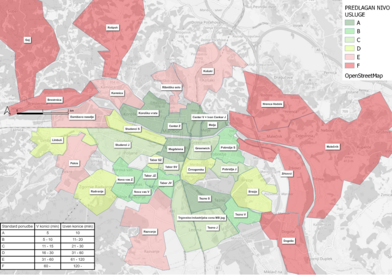 Mestno občino Maribor so razdelili na posamezna interesna območja in jim določili nivo usluge. Nadalje so sklenili, da je potrebno za območje z najvišjim nivojem potrebno zagotoviti visok standard ponudbe javnega prevoza, tako, da v času prometnih konic čakanje na avtobus ne traja povprečno več kot pet minut, izven konic pa povprečno ne več kot deset minut. Gre predvsem za središče Maribora, območja Magdalene in Tezna.