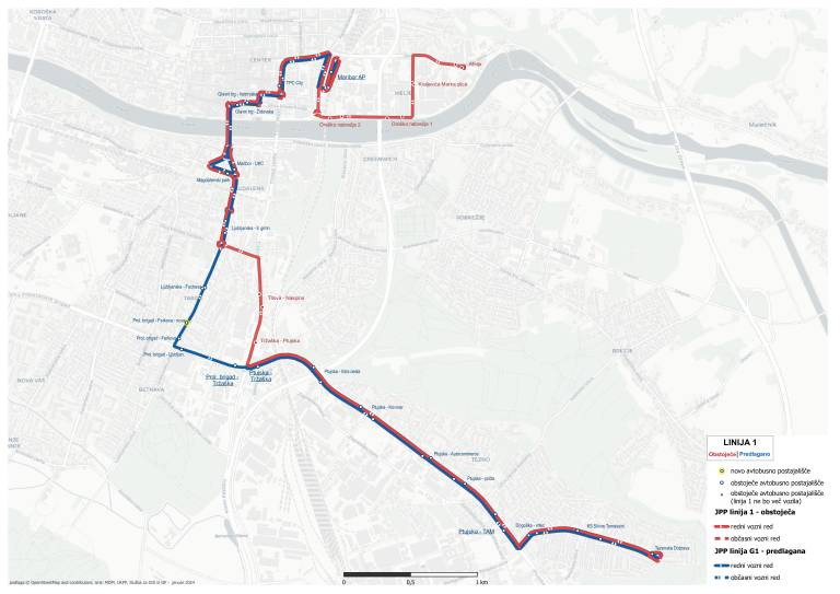 Linija 1 bo po novem predstavljala glavno linijo G1, ki bo imela pogoste odhode, v konici na deset minut. Začetno postajo avtobusov bo še vedno predstavljala glavna avtobusna postaja, zadnjo pa Tezenska Dobrava.