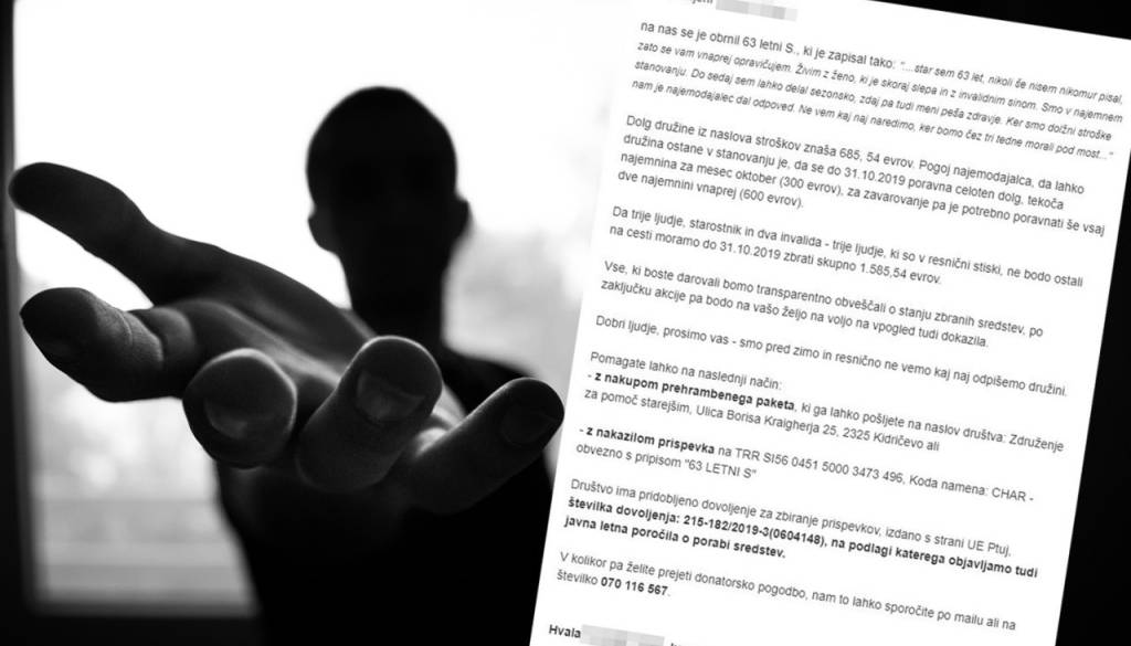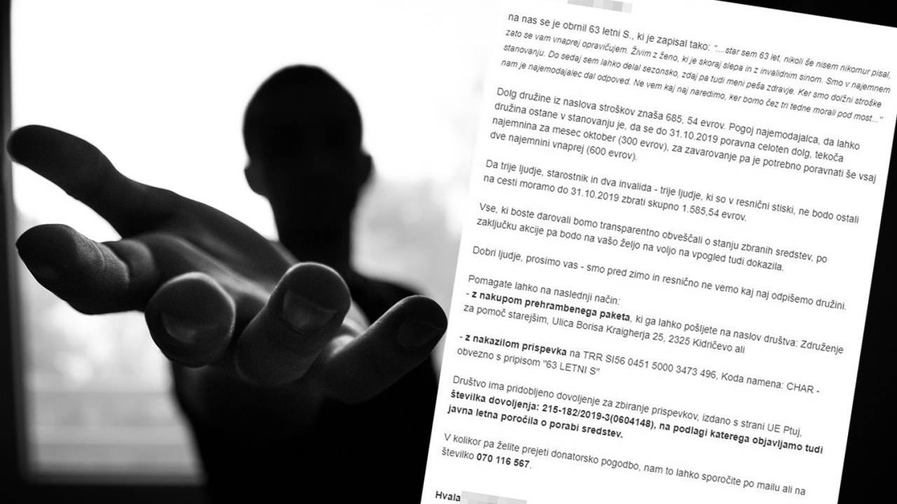 »Star sem 63 let, nikoli še nisem nikomur pisal, zato se vam vnaprej opravičujem. Živim z ženo, ki je skoraj slepa in z invalidnim sinom. Smo v najemnem stanovanju. Do sedaj sem lahko delal sezonsko, zdaj pa tudi meni peša zdravje. Ker smo dolžni stroške, nam je najemodajalec dal odpoved. Ne vem, kaj naj naredimo, ker bomo čez tri tedne morali pod most.«