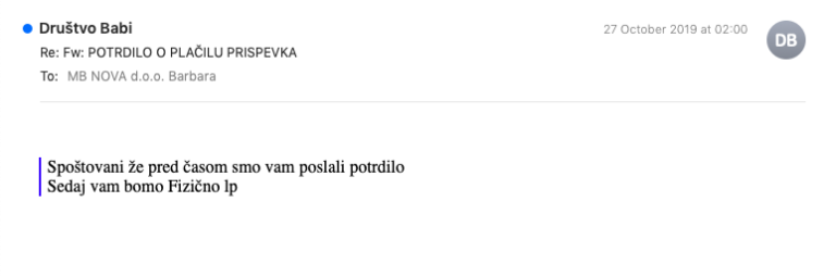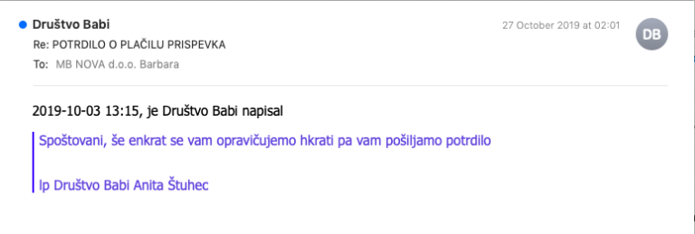 »Opažam, da je to društvo Babi kar popularno, na žalost pa v negativnem smislu. Tudi naše podjetje jim je nakazalo prispevek v višini 100 evrov, potem ko smo v elektronski predal dobili njihovo pismo. Predsednico društva sem potem večkrat klicala zaradi dokazila o nakazilu, ki pa ga kljub obljubam ni bilo (posredujem korespondenco). Te dni jo poskušam priklicati, vendar je telefon očitno izključen, elektronska pošta pa ‘napačna’. Očitno ljudje nimajo več nobene morale ...« je sporočila Mariborčanka.