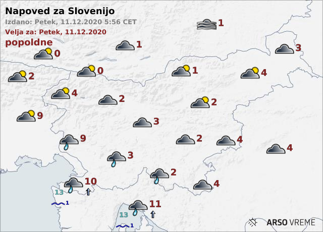 Najvišje dnevne temperature bodo od 0 do 4, na Primorskem okoli 10 stopinj Celzija.