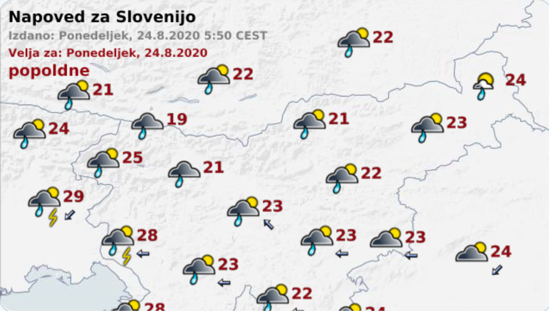 Danes bo pretežno oblačno, občasno bodo krajevne padavine, predvsem v zahodni Sloveniji popoldne in zvečer tudi posamezne nevihte.