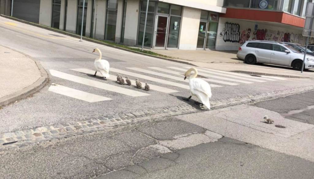 To je labodu tudi uspelo! Kasneje so objavili fotografijo, kako se vsa družina odpravlja do Drave.