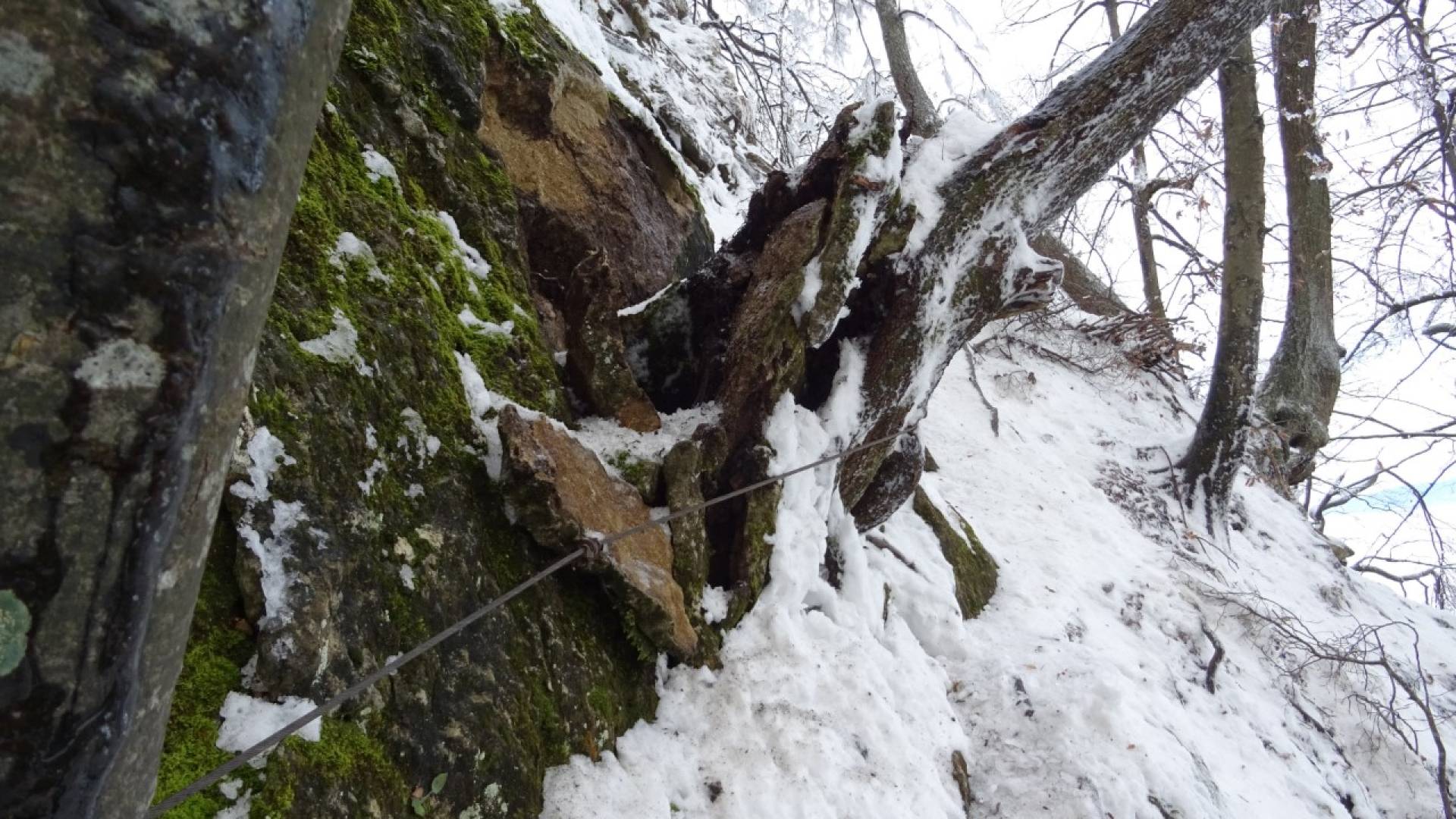 Le nekaj metrov pod vzhodnim vrhom, kjer je speljana zahtevna pot, je prišlo do podora. Trenutni podrto drevo in skale zadržuje jeklenica.