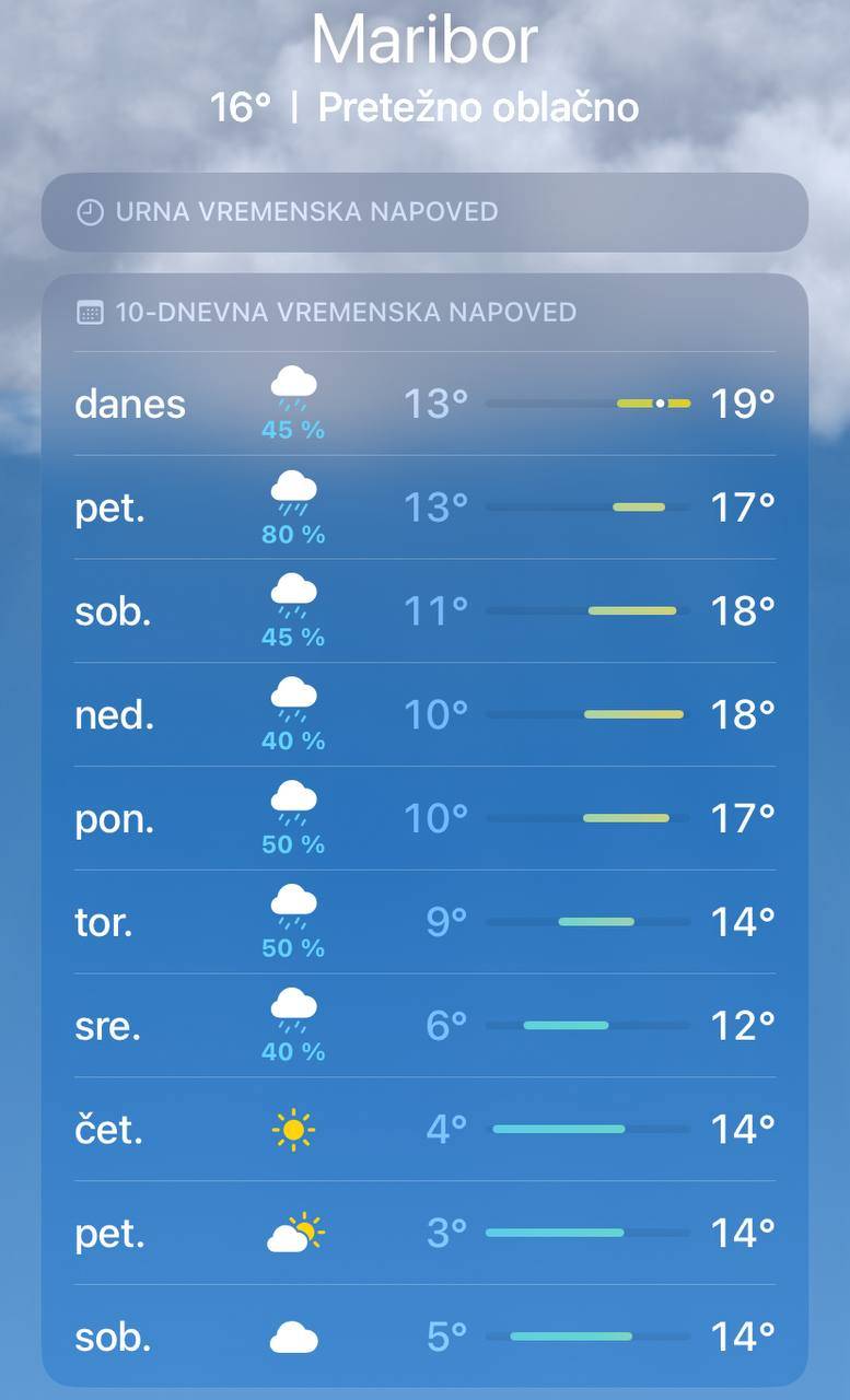 V petek bo pretežno oblačno, nekaj sonca bo predvsem v jugozahodni Sloveniji. Pojavljale se bodo manjše krajevne plohe, ki bodo verjetnejše popoldne.
