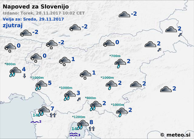 Jutri se bodo padavine razširile na vso Slovenijo. Predvsem v severnih in deloma osrednjih krajih bo lahko snežilo do nižin. Najvišje dnevne temperature bodo od 0 do 5 stopinj Celzija.