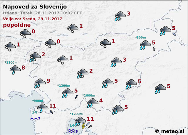 Ponoči bodo zahodno Slovenijo že zajele padavine, ki se bodo do jutra razširile tudi nad osrednje kraje. Po nižinah bo deloma deževalo, deloma snežilo, ponekod bo možna poledica. Najnižje jutranje temperature bodo od -2 do 3 stopinje Celzija.