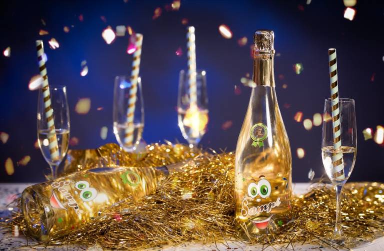 Tudi sama steklenica otroškega šampanjca Šampi je drugačna od ostalih na trgu, vsebina steklenice je namreč vidna skozi nalepko, sam videz steklenice pa je igriv, a hkrati prefinjen.